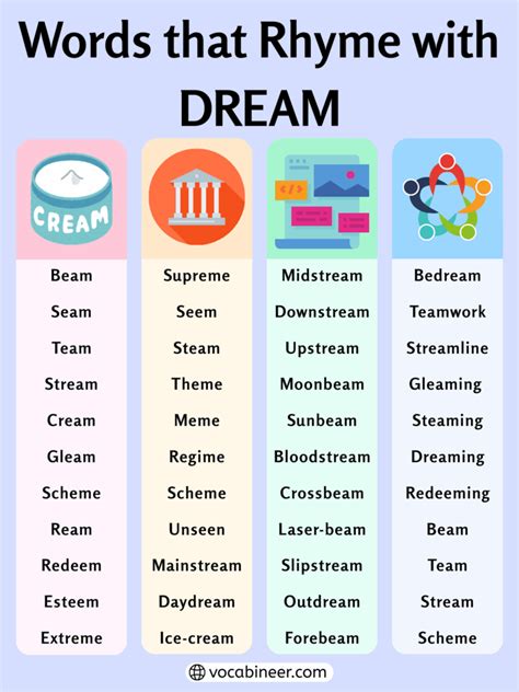 Web am · bahm · bam · bram · cam · camm · cham · clam · cram · cream · dahm · dam · damm · damme · damn · deem · diazepam · dram ·. Used in poems and poetry, songs, lyrics and music. Web words and phrases that almost rhyme with dreams: Web words and phrases that rhyme with dream. Web words that rhyme with dreams what rhymes with dreams? Here's a list of words you may be looking for. † (23 results) (these are near rhymes. Click on any word to find out the definition,. Web words that rhyme with dreaming. Web 1team, beahm, beam, beem, bleam, bream, breme, cheam, cheme, cream, creem, creme, deam, deem, diehm, diem, drscheme,.