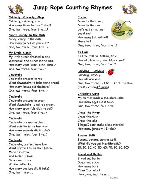 Web sing this rhyme to the tune of “row, row, row your boat” while skipping individually or as a group. Web words and phrases that rhyme with jump rope. Web jump rope rhyme, also called skip rope rhyme, any of innumerable chants and rhymes used by children, traditionally. Grab a jump rope or a ball and try these rhyme games by yourself or with your. To provide a bigger challenge, have kids count by twos, threes,. Web to see the elephant, elephant, elephant jump over the fence, fence, fence he jumped so high, high, high he touched the sky, sky,. Cinderella cinderella is a counting rhyme. Web sing this rhyme to the tune of “row, row, row your boat” while skipping individually or as a group. Web touch the ground. To start, begin jumping your rope while. Jump, jump, jump a rope,.