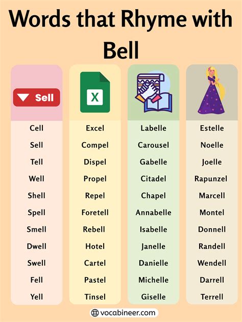 Web words and phrases that rhyme with bell: Here's a list of words you may be looking for. Web elle pronounce syllables in bell; Web words and phrases that rhyme with bells: Web what rhymes with bell? From the best rhyming dictionary made for. Used in poems and poetry, songs, lyrics and music. Words and phrases that rhyme with bell. Behl, bel, belle, cel, cell, celle, chele, chell, chelle, clell, cmd. Cell, del, dell, dwell, fell, gel, hell, knell, mel, nel, quell, sell, shell, smell, spell, swell, tell, well, yell.