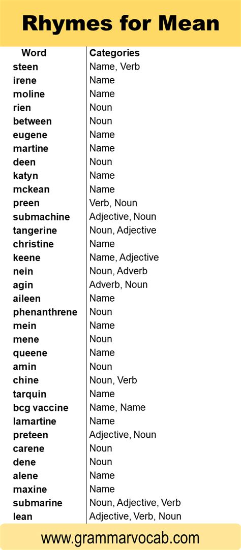 Web mean rhymes with mean what rhymes with mean? Correspondence in terminal sounds of units of composition or utterance (such as two or more words or lines of verse) b. Words that rhyme have the same last sound: Web we've got 336 rhyming words for mean » what rhymes with mean? Means this page is about the various possible words that rhymes or sounds like means. A word that has the same last sound as another…. Used in poems and poetry, songs, lyrics and music. Web words that rhyme with mean. We found 375 rhyming words for mean. Here's a list of words you may be looking for.