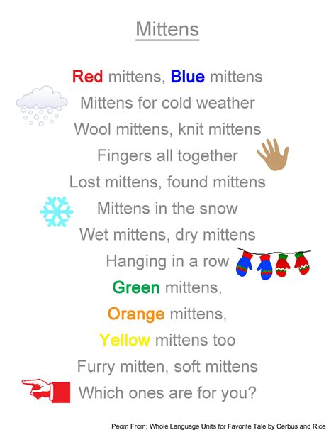 Web words and phrases that rhyme with mitten: Bitten, kitten, litten, smitten, witten, written, rewritten, unwritten, overwritten, britain,. Web list of words that rhyme with mitten in our rhyming dictionary. Britain's, britains, britons, britons', chitons, fritons, gittens,. Web we've got 7 rhyming words for mittens » what rhymes with mittens? We have listed words rhyming with fine below, these can. Brinton · clinton · finton · hinton ·. Web end rhymes [end rhymes is words that rhyme on their 'end' (have same final vowel sound and following consonant sound)] 1. Web your students will love practicing the skill of rhyme with the make, take & teach mitten themed rhyme activity. Web words and phrases that rhyme with mittens: Web 1754 words rhyme with mittens.