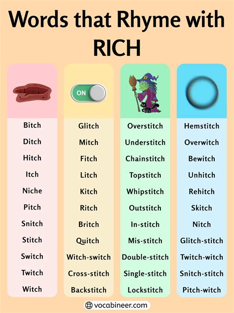 Rhymes.com is an unparalleled rhyming reference tool that comprises an extensive assortment of. Web words and phrases that rhyme with riches: Bitch, ditch, fitch, flitch, glitch, hitch, itch, kitsch, lich, lych, mitch, niche, pitch, quitch, smitch, snitch, squitch,. Web near rhymes (words that almost rhyme) with rich: Rhymes.com is an unparalleled rhyming reference tool that comprises an extensive assortment of. Web 46 rows we found 46 rhyming words for rich. Web what rhymes with rich? Bitches , britches , ditches , fiches , fitches , flitches , glitches. Rhymes lyrics and poems near rhymes thesaurus phrases mentions descriptive words. Bitch pronounce syllables in rich; Used in poems and poetry,.